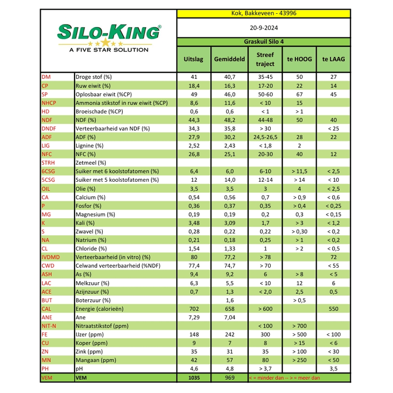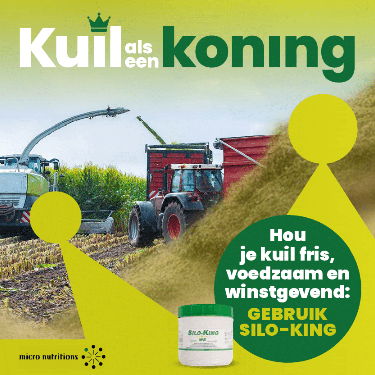 SiloKing erbij, alles voor het resultaat   Silo-King is het innovatief toevoegmiddel voor maiskuil. Het geheim achter dit kuiltoevoegmiddel is de samenwerking van natuurlijke bacteriën, enzymen en antioxidanten. Deze verbeteren het microklimaat in uw maiskuil, waardoor de gunstige ‘homozygote fermentatie’ en dus snel en koele fermentatie op gang komt. Met  SiloKing inkuilmiddel  behaalt u direct rendement:  geen inkuilverlies, betere verteerbaarheid en langer houdbaar. Met Silo-King toevoegmiddel voor maiskuilen meer liters melk uit dezelfde kilo ruwvoer.