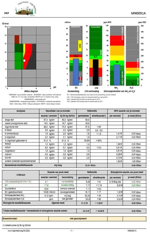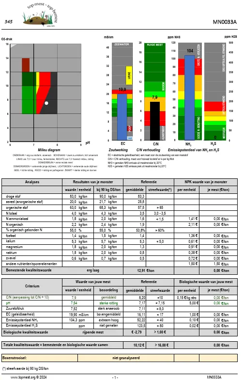 - pH: Een pH lager dan 7.15 geeft aan dat de mest fermenteert en dus een gewenste microbiologie bevat. Vanaf een pH hoger dan 7.25 nemen de aantallen pathogenen snel toe en krijgen we een steeds heftiger rottingsproces met vorming van giftige metabolieten, waarvan sommige gasvormig zijn (waterstofsulfide, blauwzuurgas, koolstofmonoxide, methaan, etc.). Dit zijn groei remmende stoffen.