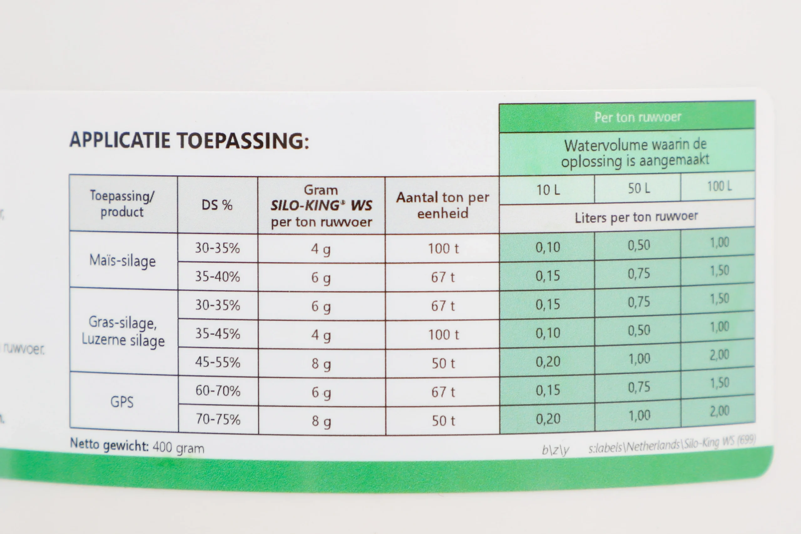 De homozygote fermentatie door Silo-King verbetert de verteerbaarheid met gemiddeld 5%. De koe breekt de celwanden van het ruwvoer gemakkelijker af. Behalve meer melk uit uw ruwvoer heeft dit nog meer voordelen. Silo-King zorgt voor een snelle daling van de zuurgraad en een snelle, koele fermentatie. Zo voorkomt u broei en schimmelvorming door respiratie. Uw kuil kan na drie weken al aangebroken worden. De antioxidanten in Silo-King vangen het ingesloten zuurstof in de kuilbult op, waardoor de respiratie tot stilstand komt. Bij het openen van de kuilbult om te voeren, gaan de antioxidanten opnieuw aan het werk om respiratie te stoppen. Zo blijft uw ruwvoer langer houdbaar, en smakelijker en voedzamer voor uw vee.