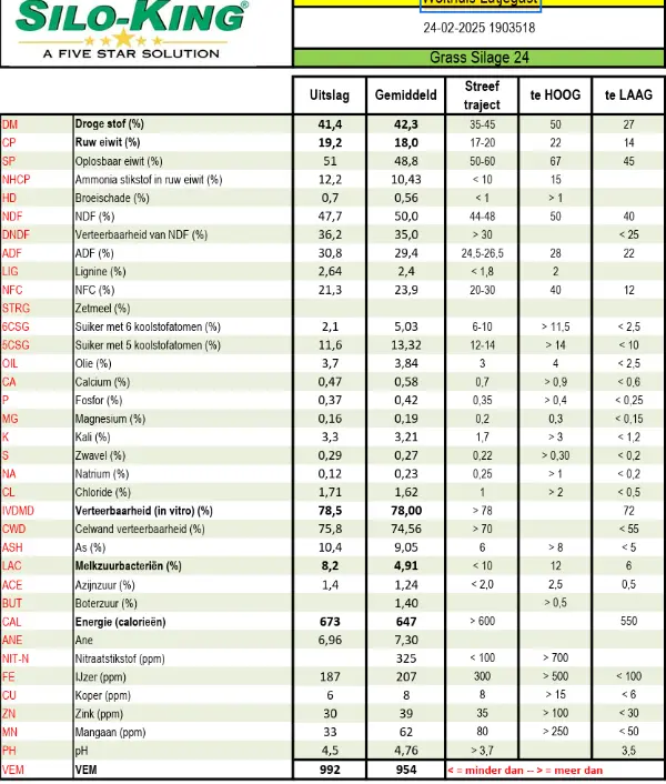 Dan moet je niet bezuinigen op een paar honderd euro. SiloKing van Micro Nutritions zorgen voor goede conservering en voor vertering. Dat geeft een gerust gevoel.” Het resultaat is zichtbaar. “Bij de eerste keer monstername van de mais van 2024 zaten we op 920VEM. Nu bij het voeren, met dezelfde mais, halen we er 100 VEM méér uit.” Toch plaatst hij er ook een kanttekening bij: “De middelen werken alleen als je als boer zelf ook goed werk levert. Als je de kuil niet netjes verwerkt en afdekt, hoef je er geen producten in te gooien.”