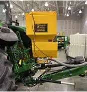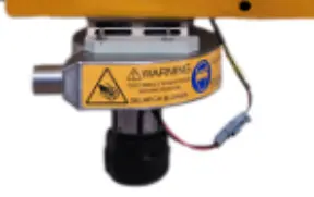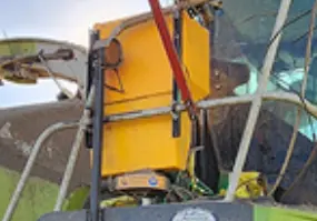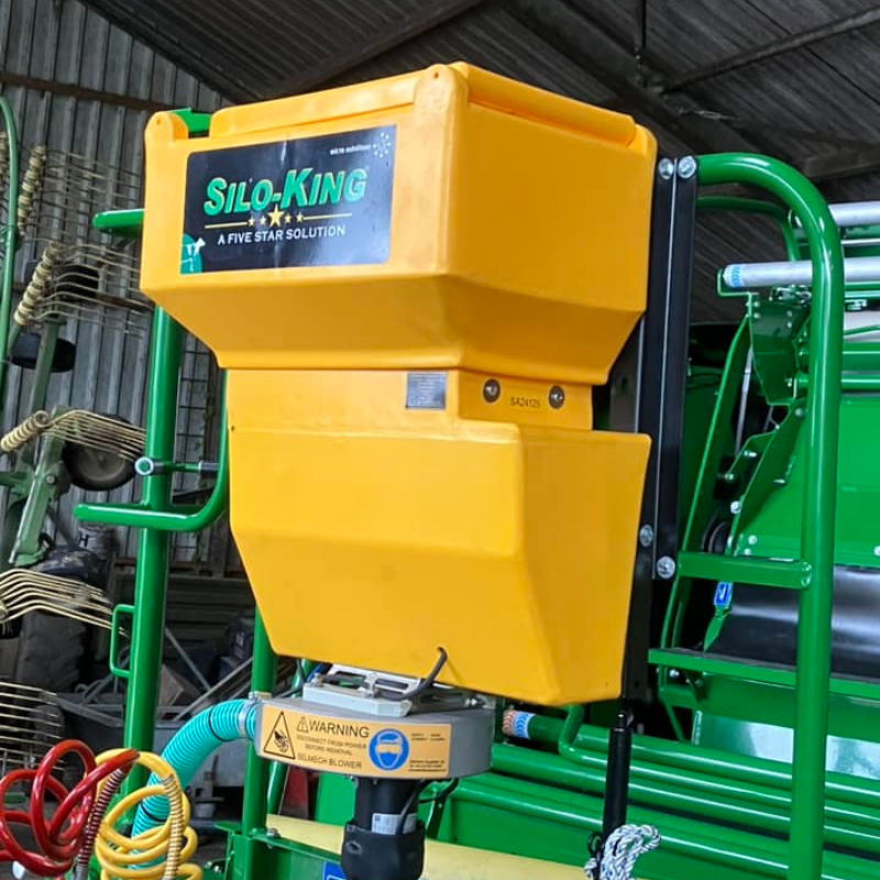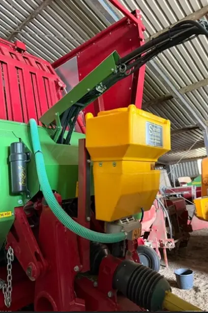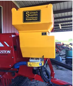 De blazer kan zo worden gemonteerd dat de uitlaat van de buis naar links of rechts wijst. Hij kan worden gemonteerd op zowel de 50 kg als de 80 kg Powdermaster, met een digitale of niet-digitale controller. Hierboven ziet u enkele afbeeldingen van hoe de Powdermaster op sommige machines is gemonteerd ( hakselaar, opraapwagen, balenpers) .
