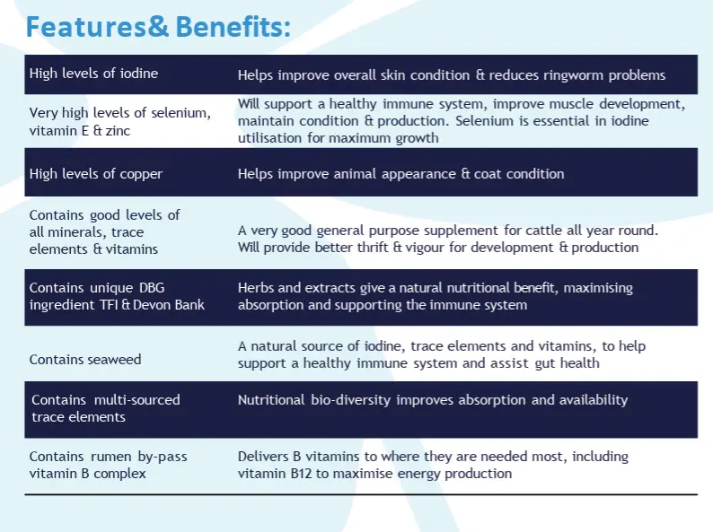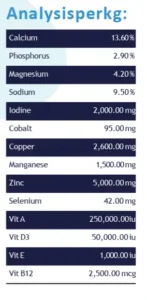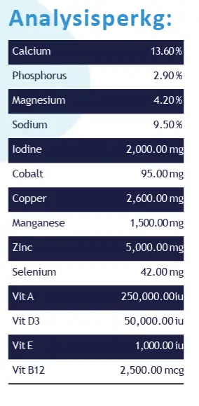 Zeer hoge concentratie Selenium, vitamine E en Zink, deze ondersteunen een gezond immuunsysteem, bevorderen de spierontwikkeling en houd de conditie en productie op peil. Daarnaast is Selenium essentieel voor de benutting van Jodium voor maximale groei.